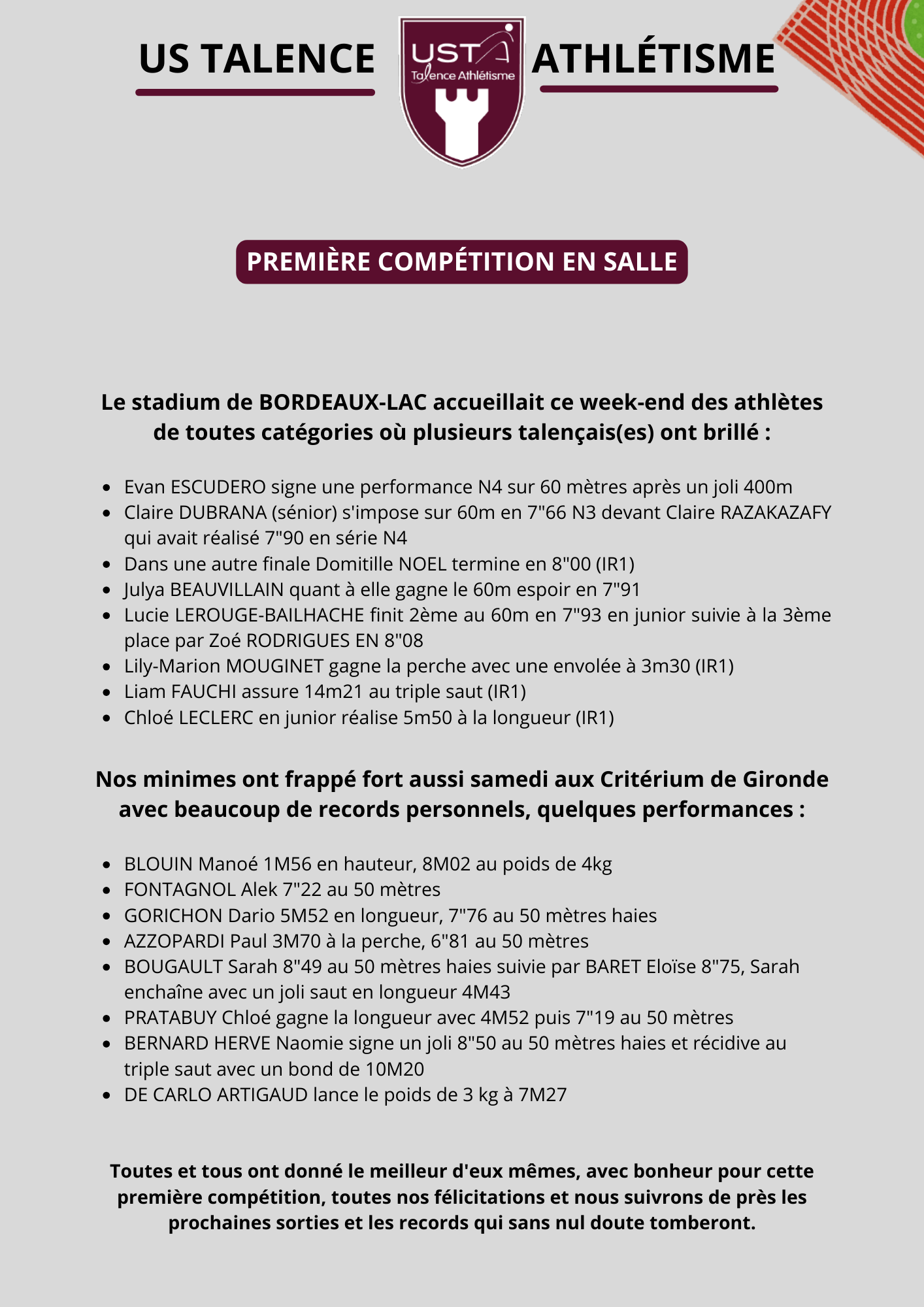 PREMIERE COMPETITION EN SALLE A BORDEAUX LAC par Gwenn LE MEINS | Déc 12, 2025 | Actualité | 0 commentaires Poster le commentaire Annuler la réponseVotre adresse e-mail ne sera pas publiée. Les champs obligatoires sont indiqués avec *Commentaire * Nom * E-mail * Site web Enregistrer mon nom, mon e-mail et mon site dans le navigateur pour mon prochain commentaire.