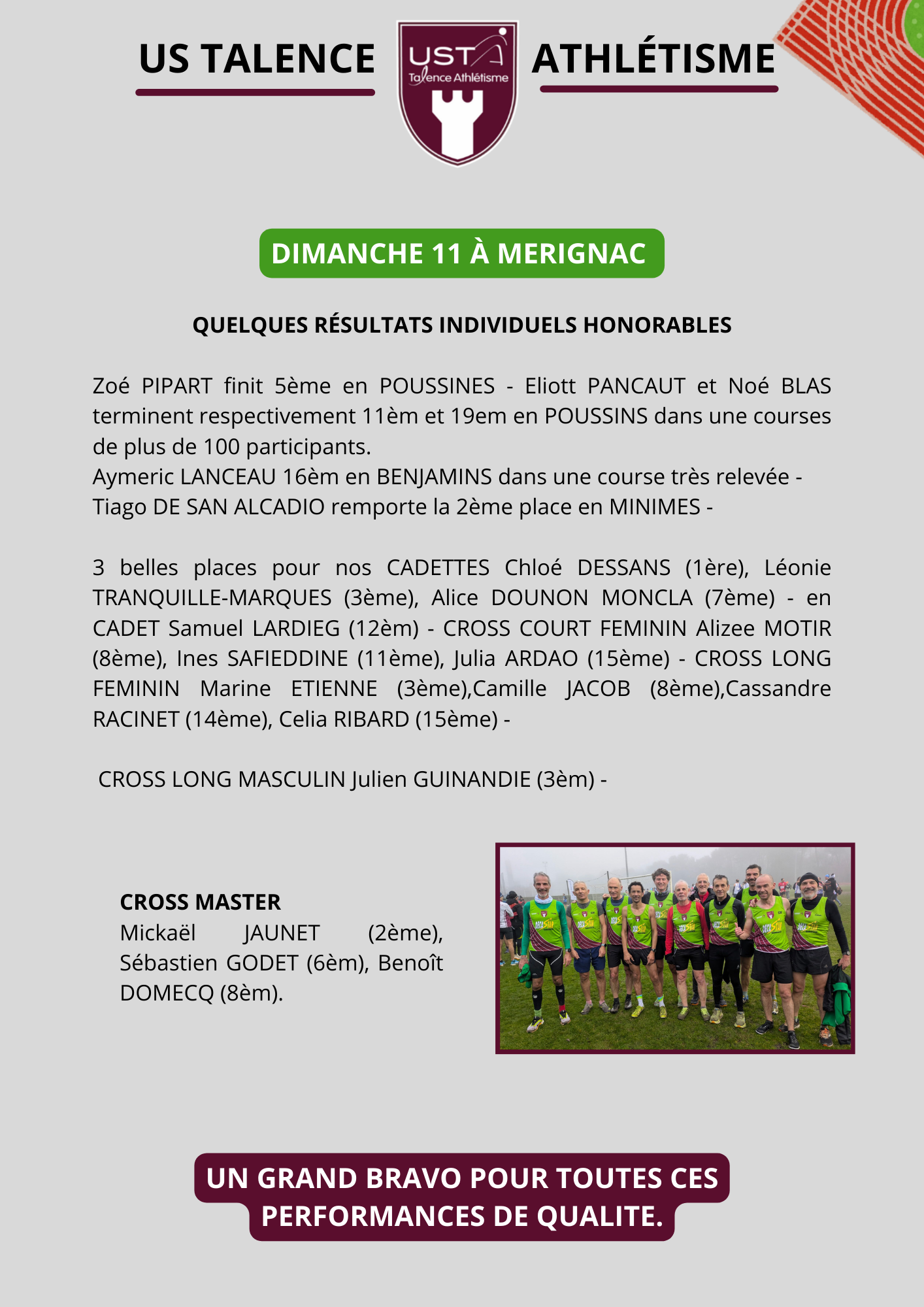 LES TALENCAIS PRESENTS ET BRILLANTS, EN CROSS ET EN SALLE par Gwenn LE MEINS | Jan 17, 2026 | Actualité | 0 commentaires Poster le commentaire Annuler la réponseVotre adresse e-mail ne sera pas publiée. Les champs obligatoires sont indiqués avec *Commentaire * Nom * E-mail * Site web Enregistrer mon nom, mon e-mail et mon site dans le navigateur pour mon prochain commentaire.